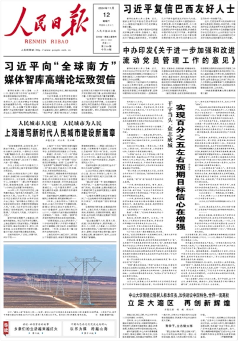 Page 1: Let’s begin with two reports about Xi Jinping. First, there’s a report on Xi’s congratulatory message to the Global South Media and Think Tank Forum being held in Brazil. Xinhua reports: